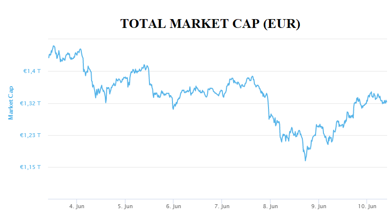 This week, the total market capitalization exceeded 1.32 trillion EUR. Decrease at the 7-day interval is 7.04 %. Bitcoin decreased by 6.33 % during the week to a current value of over 30,300 EUR. Bitcoin dominance is 43 %.