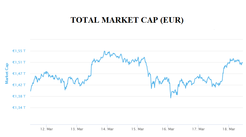 This week, the total market capitalization exceeded 1.44 trillion EUR. Decrease at the 7-day interval is 0.3 %. Bitcoin decreased by 0,3 % during the week to a current value of over 46.400 EUR. Bitcoin dominance is 60.4 %.