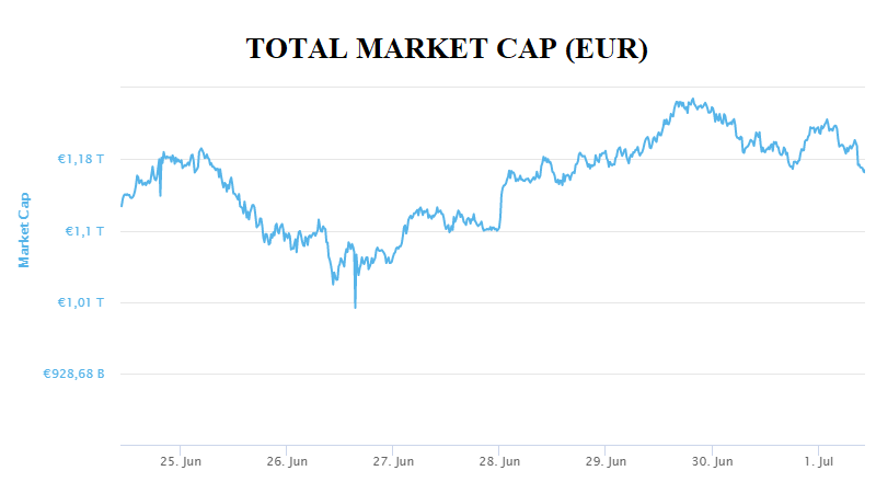 This week, the total market capitalization exceeded 1.16 trillion EUR. Increase at the 7-day interval is 3.5 %. Bitcoin decreased by 0.5 % during the week to a current value of over than 28,300 EUR. Bitcoin dominance is 45.5 %.