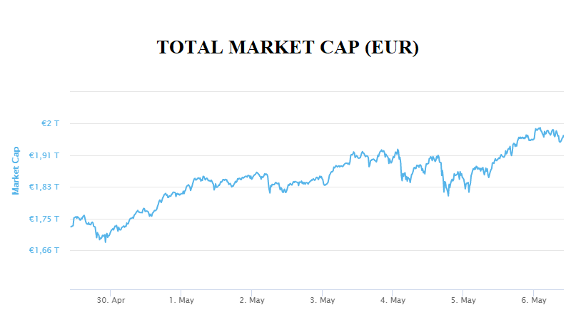 This week, the total market capitalization exceeded 1.96 trillion EUR. Increase at the 7-day interval is 15 %. Bitcoin increased by 5 % during the week to a current value of over than 47,400 EUR. Bitcoin dominance is 45.1 %.