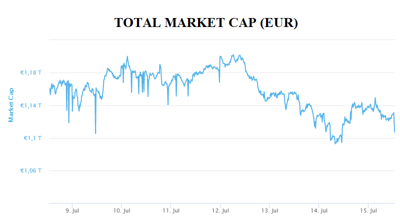 This week, the total market capitalization exceeded 1.11 trillion EUR. Decrease at the 7-day interval is 10.1 %. Bitcoin decreased by 2.13 % during the week to a current value of over than 27,000 EUR. Bitcoin dominance is 46 %.