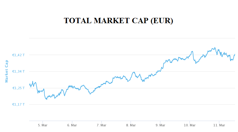 This week, the total market capitalization exceeded 1.41 trillion EUR. Bitcoin grew by almost 13 % during the week to a current value of over 46 700 EUR. Bitcoin dominance is 61.1 %.