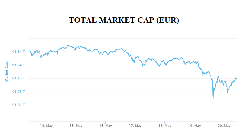 This week, the total market capitalization exceeded 1.42 trillion EUR. Decrease at the 7-day interval is 26 %. Bitcoin decreased by 20 % during the week to a current value of over than 32 700 EUR. Bitcoin dominance is 42.8 %.